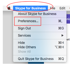 1. On the top left side of your screen, click Skype for Business and then go to Preferences.