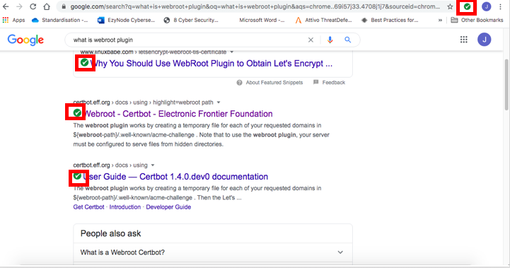 In the example below, Webroot Filtering Extension feature shows the reputation of the pages in the browser search results, as you can see most of the website has the green tick mark annotation which implies that those sites are protected to visit and will not cause any harm to your device.