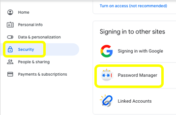 2. Click Security and go to the bottom part of the page, click Password Manager.
