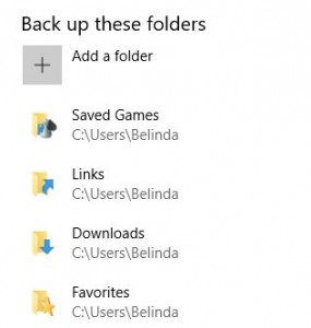 - Under the Back up these folders heading, ensure that Windows has included the important folders you require. To remove a folder, click it once and select the Remove button. If a folder is missing from the list, click Add a folder and select the folder you wish to add