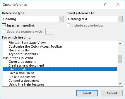 - From the Insert reference to drop-down menu, select what you want to link to e.g. the actual heading text, the page number etc