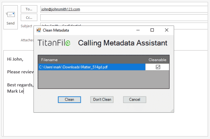 Instead of manually scrubbing metadata from your files before you send them, you can use TitanFile’s Secure Send add-in for Outlook which integrates with PayneGroup’s Metadata Assistant to remove metadata from files before they are sent.