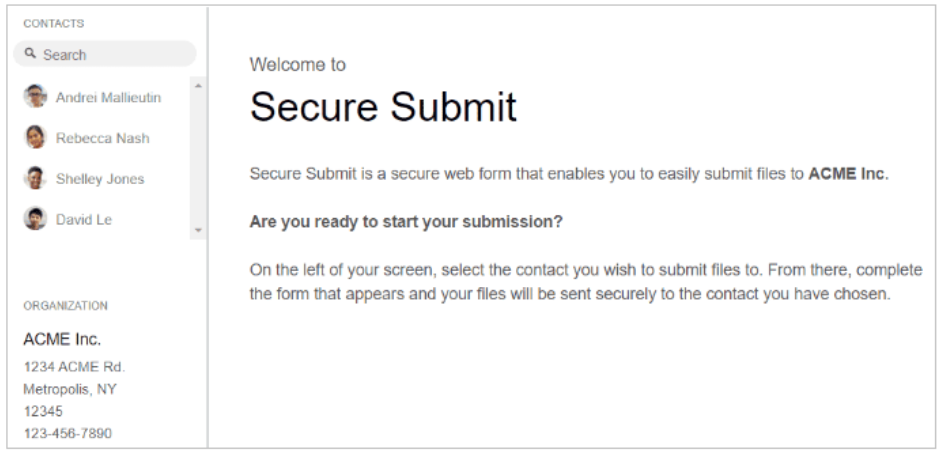 Whether you have 5 staff members or 500 staff members at your company, Secure Submit is a secure web form that provides a quick, easy, and secure way for your clients and other external parties to share files directly with your team.