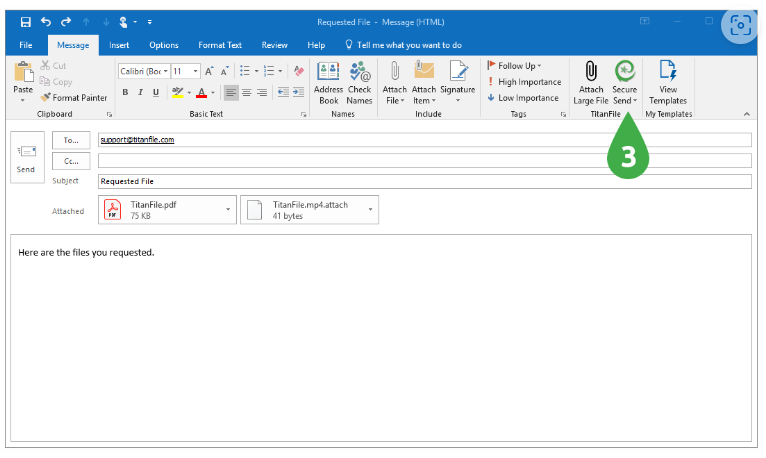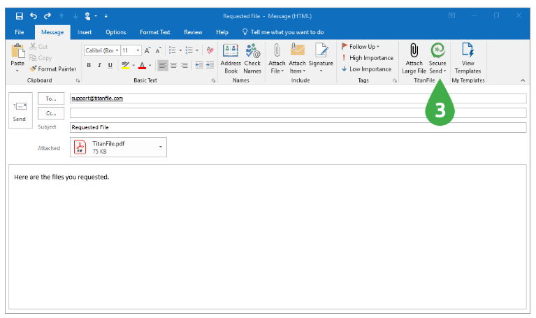Simply install the TitanFile Secure Send add-in for Outlook™ and compose emails as you normally would. When you’re ready to send your email, just click the new "Secure Send" button in the Outlook email toolbar.