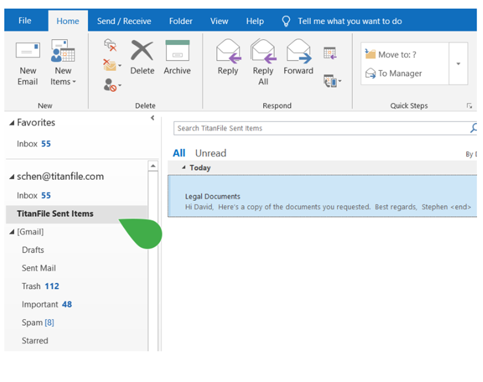 Emails sent with Secure Send will appear in a new folder called "TitanFile Sent Items."