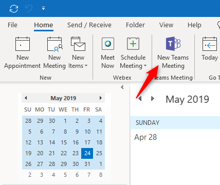 From your Outlook Calendar, click New Teams Meeting located on the Home ribbon.