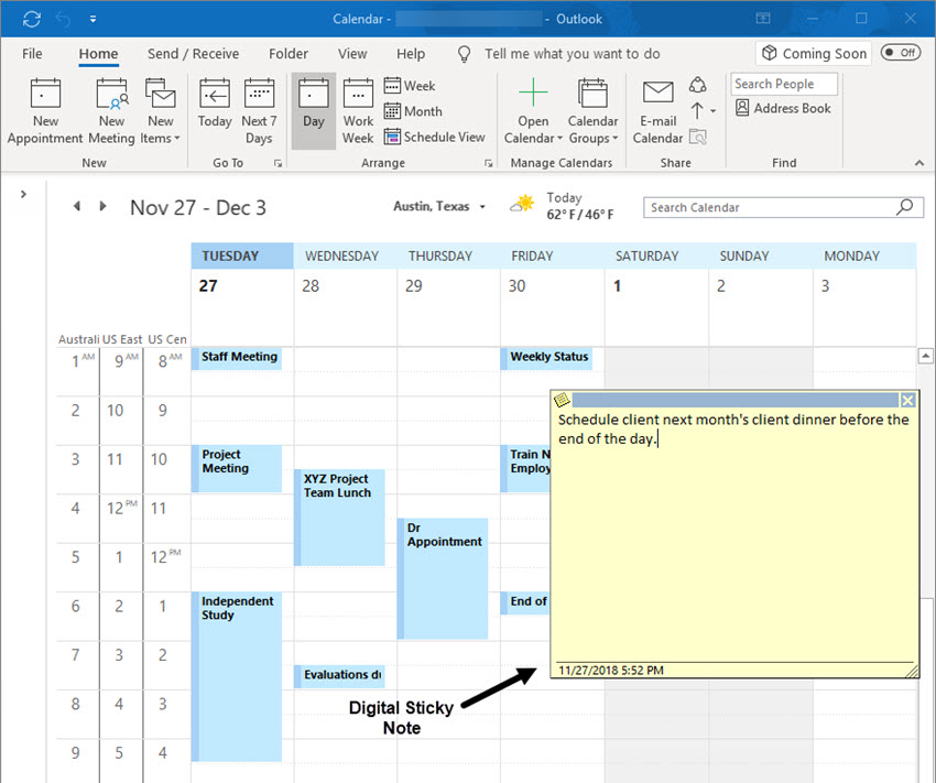 Outlook has a built-in sticky notes feature. You can press Ctrl+Shift+N from anywhere in the Outlook interface or go to "New Items" and click "Notes" to create a new note, which can be dragged and positioned anywhere on the screen. The nice thing about digital notes is that it won't peel off and get lost.